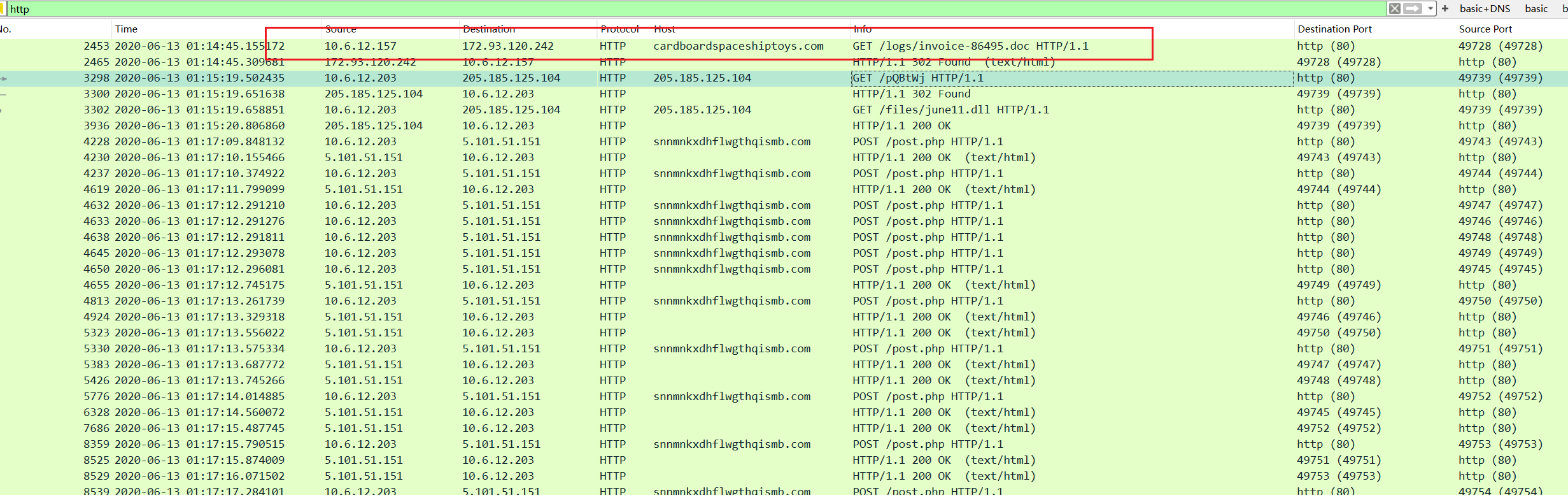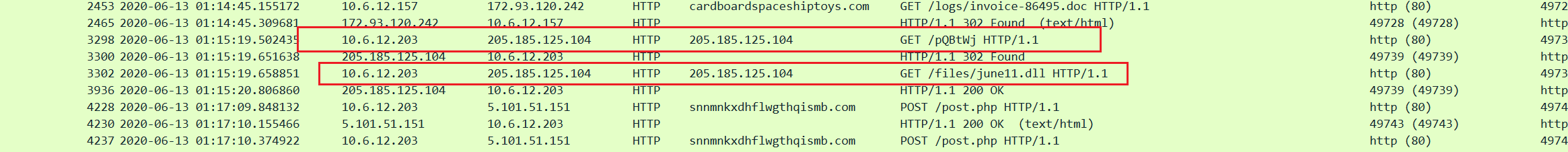 3302 2020-06-13 01:15:19.658851 10.6.12.203 205.185.125.104 HTTP 205.185.125.104 GET /files/june11.dll HTTP/1.1 http (80) 49739 (49739) 312 Intel_6d:fc:e2 Cisco_29:41:7d