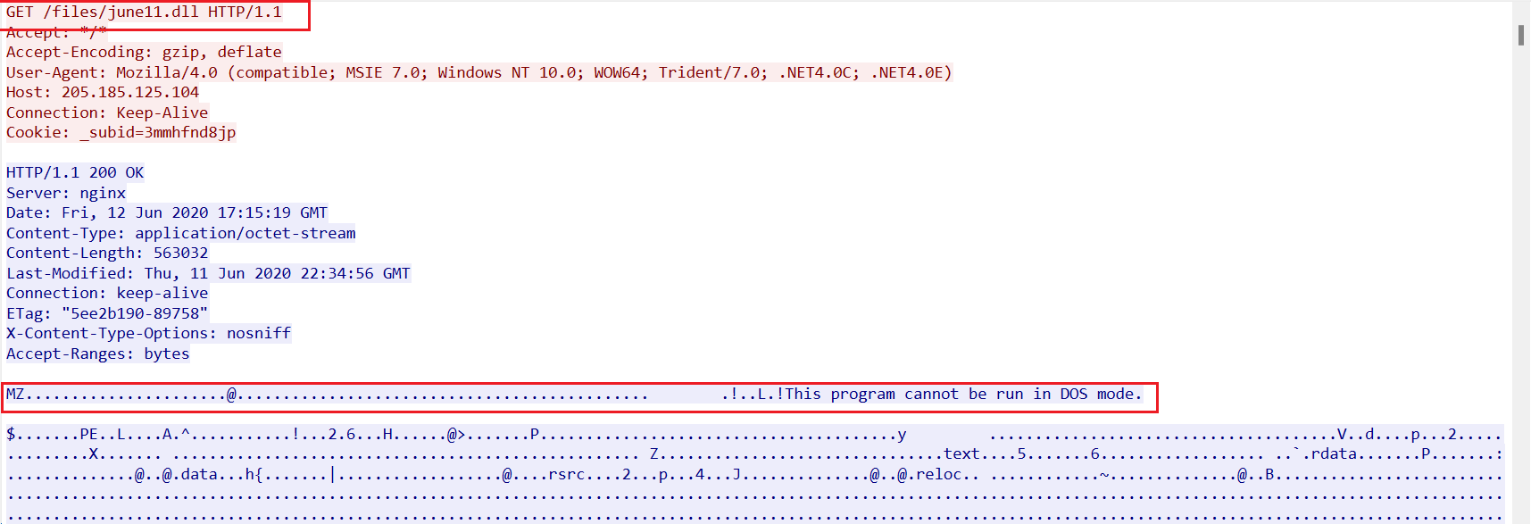 发现在GET http://205.185.125.104/files/june11.dll后,响应了一个可执行文件