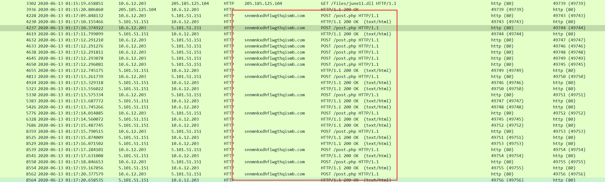5776 2020-06-13 01:17:14.014885 10.6.12.203 5.101.51.151 HTTP snnmnkxdhflwgthqismb.com POST /post.php HTTP/1.1 http (80) 49752 (49752) 668 Intel_6d:fc:e2 Cisco_29:41:7d