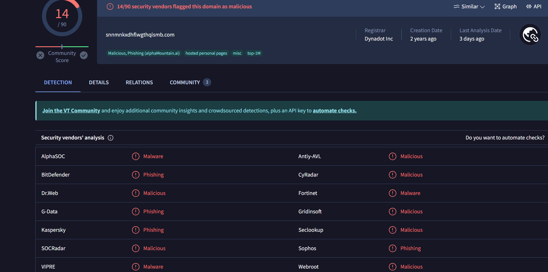 利用virustotal查询域名snnmnkxdhflwgthqismb.com