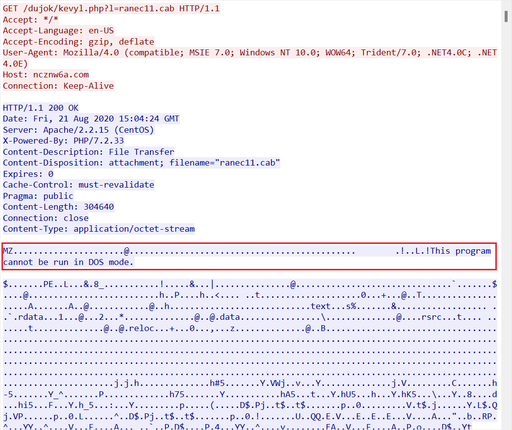 追踪第一条流,可以看到传输的是一个DLL可执行程序