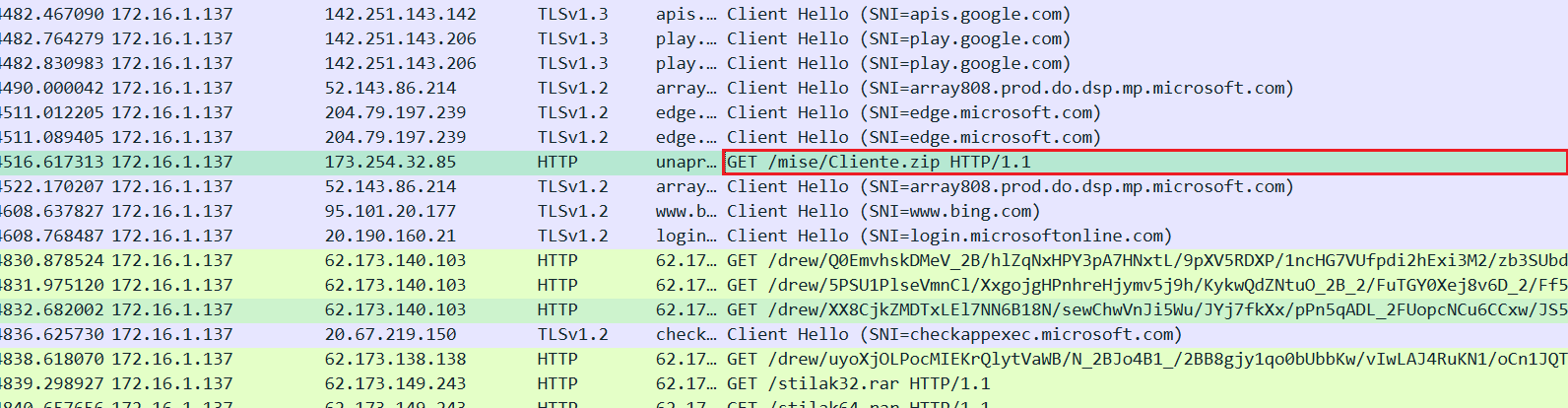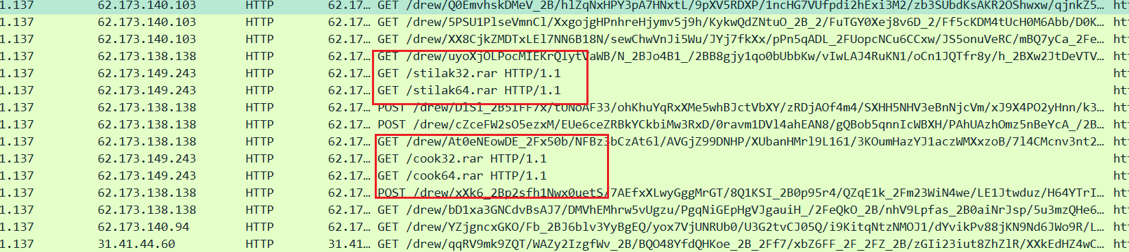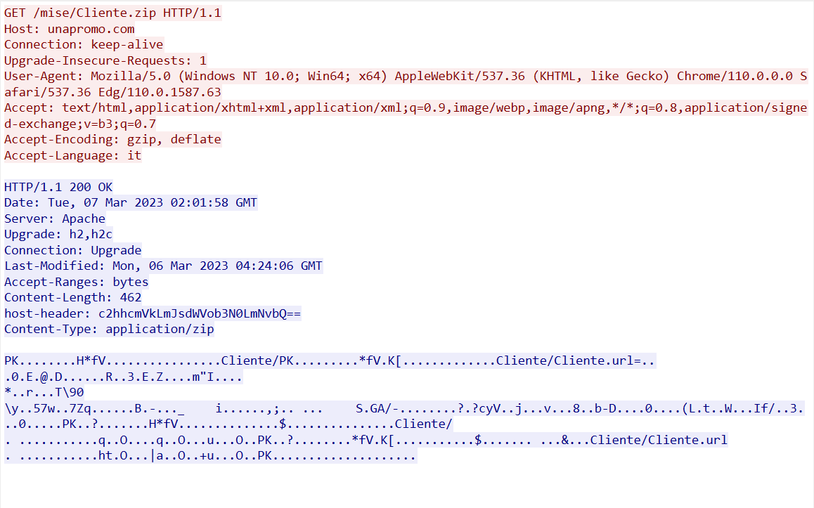 Posted 2024-05-08Updated 2025-08-27malware_trafficFinding Gozi - Unit 42 Wireshark Quiz, March 2023Unit 42 Wireshark Quiz, March 2023 学习记录请求流首先看一下请求流都有啥东西发现一个请求追踪后其请求了zip文件 ZIP文件分析在虚拟机中将zip文件导出其文件内包含了一个URI,该URI是以file为开头的,那么就会产生SMB流量 SMB流量分析那就导出SMB流量传输的文件,发现文件并不是完全的,那就无法分析 感染流量分析查看在请求ZIP文件之后的HTTP流量,发现其又请求了四个rar文件流被加密,无法查看,且传输的是加密过的二进制文件 知识参考Finding Gozi: Answers to Unit 42 Wireshark Quiz, March 2023 #trafficmalware