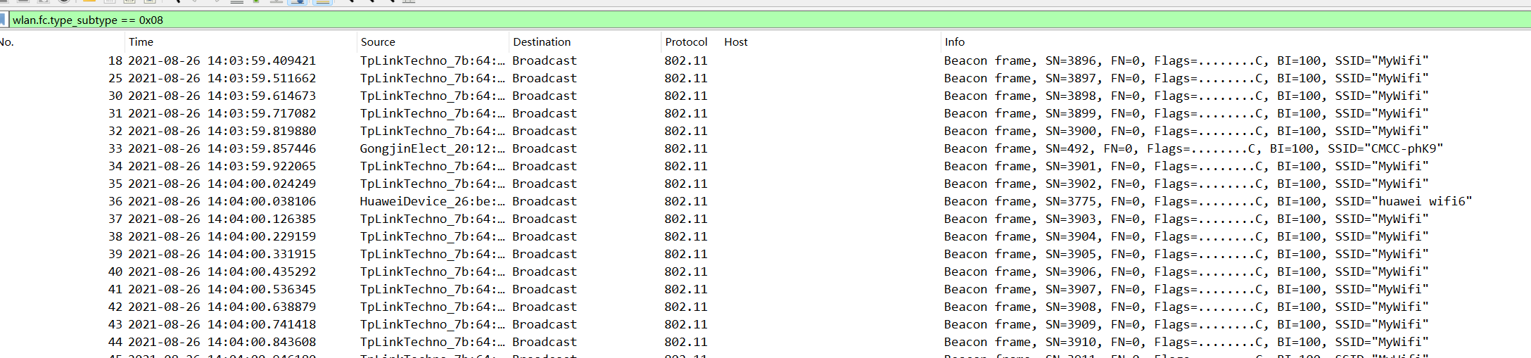 利用命令wlan.fc.type_subtype == 0x08过滤出WLAN流量的广播包