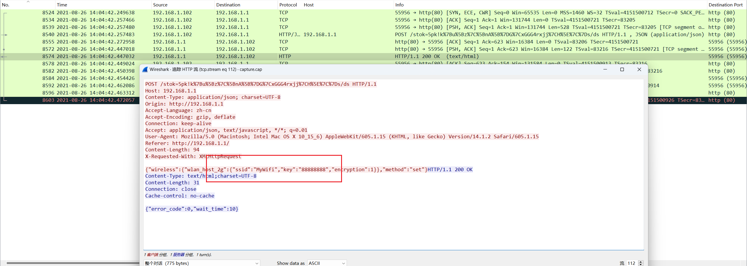 通过查看HTTP流,发现其传输了密码,博主运气好,只看了一条流,就看到了密码