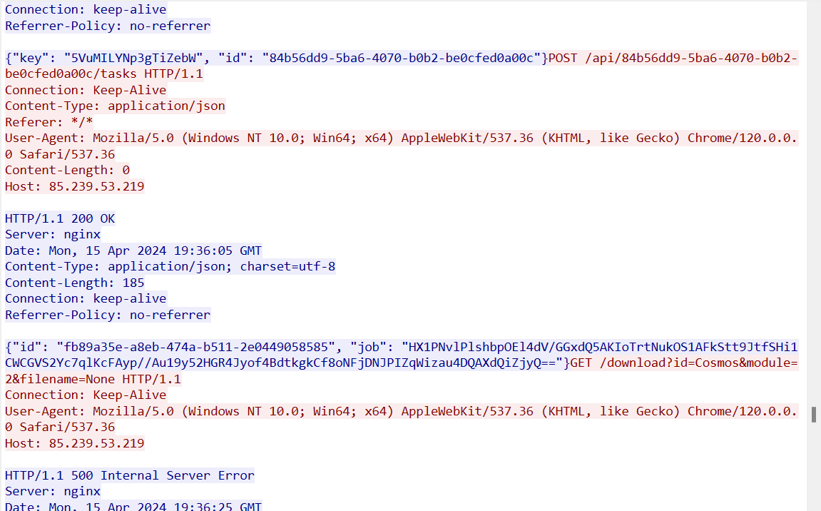 - 85.239.53.219 port 80 - 85.239.53.219 - GET /download?id=Cosmos&module=2&filename=None HTTP/1.1