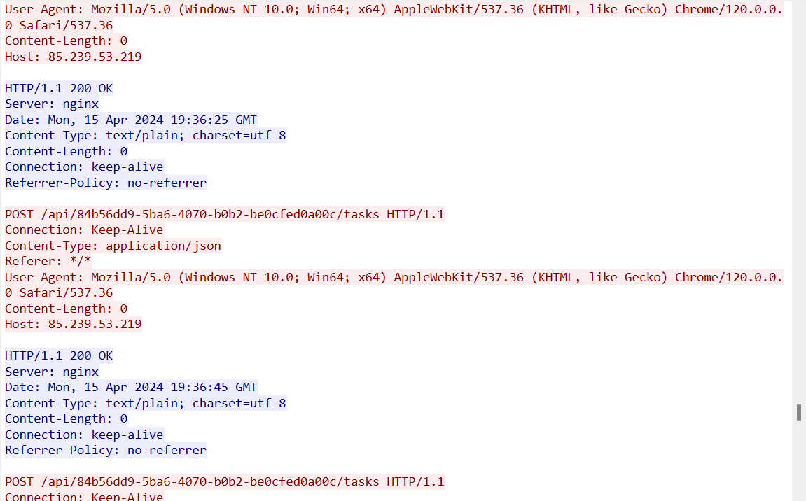 - 85.239.53.219 port 80 - 85.239.53.219 - POST /api/b0408631-d621-61e4-7035-f7d17fc50af8/tasks HTTP/1.1
