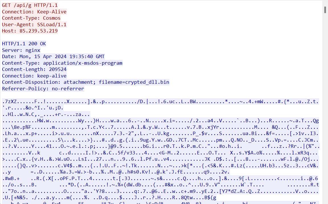 首先看到HTTP为主要流量,且UA为SSLoad也就是题目所提出的SSLOAD恶意软件,可以看出其向HOST为85.239.53.219发出请求,响应了crypted_dll.bin二进制文件